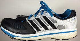 Here are my Adidas Supernova shoes with the Boost expanded thermoplastic urethane ETPU soles. These soles have great resilience or energy return so they are fun to run in. They weight 334 g per shoe which is 35 g or 10% more than my first generation Adidas Boost ShoesI had worn these for about six weeks and you can see the discoloration of the ETPU from the sunlight.